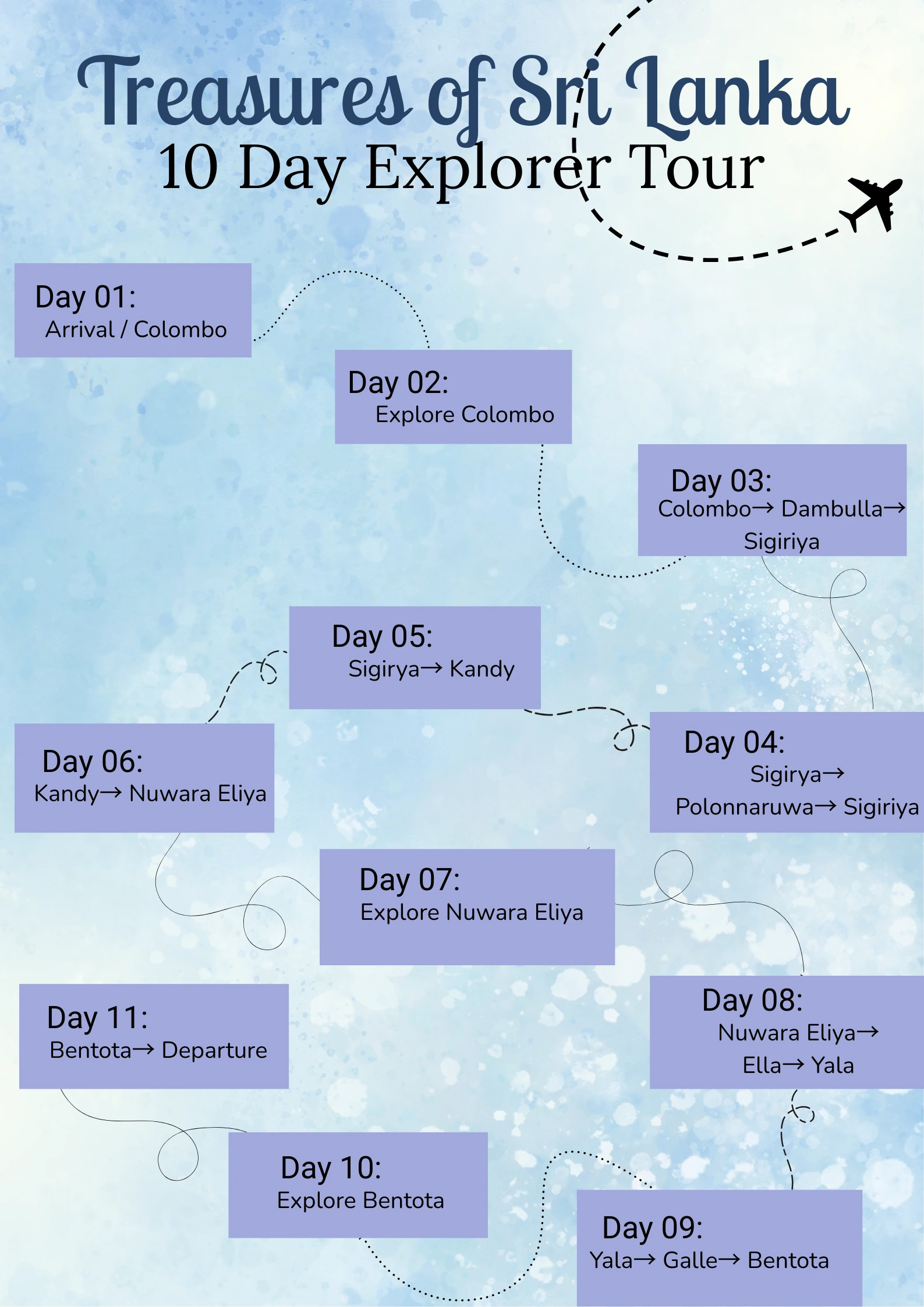 Embark on an unforgettable 10-day adventure across the Island of Wonders. Treasures of Sri Lanka brings you the perfect blend of ancient history, breathtaking landscapes, wildlife encounters, and relaxing coastal beauty crafted especially for travelers seeking an immersive and authentic Sri Lankan experience.